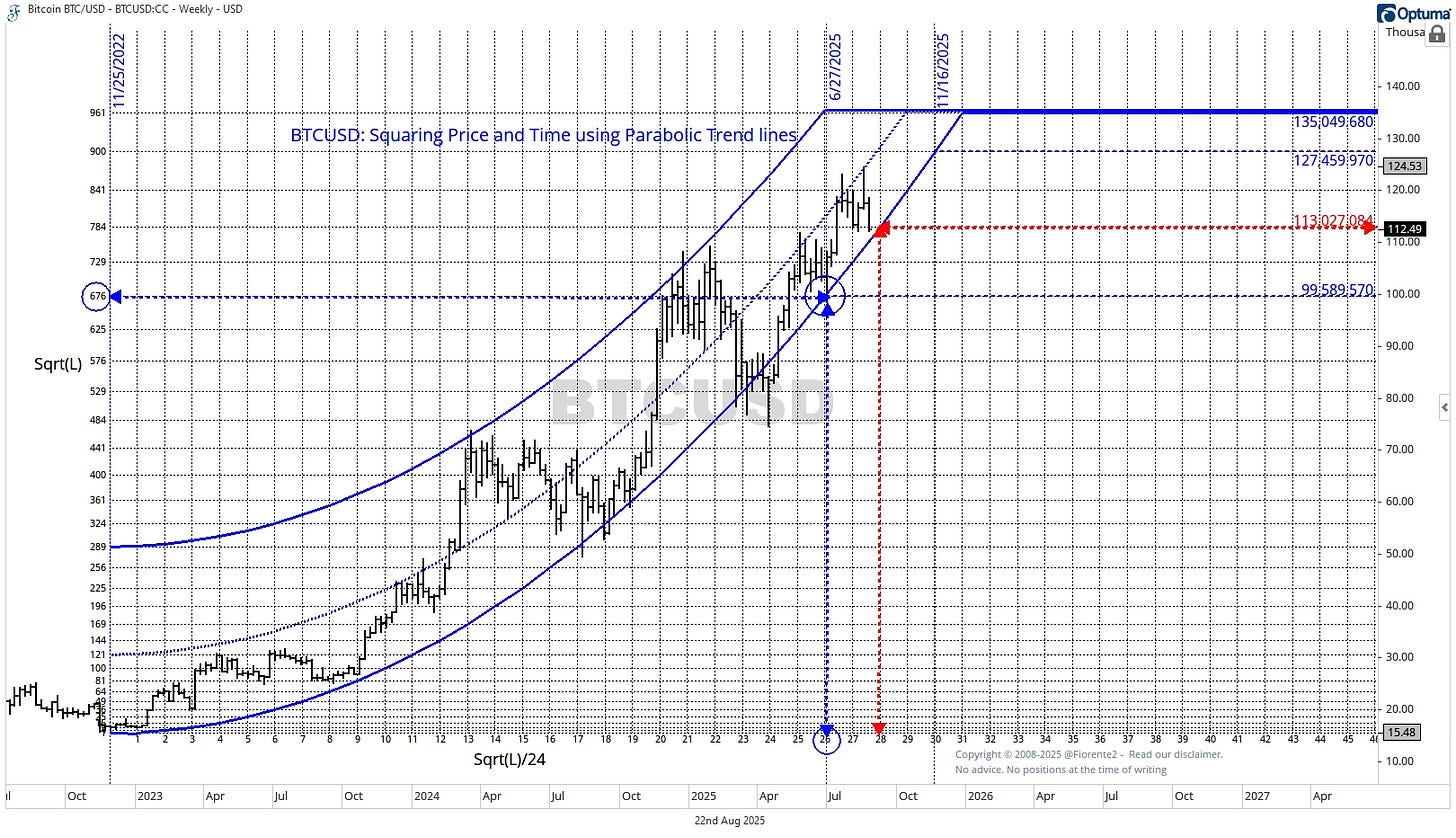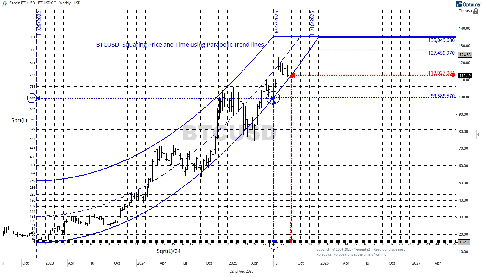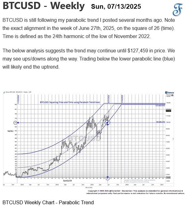 As a premium subscriber, you may recall my Subscribers' post from July 12, which updated my March 17th post. It showed BTCUSD trading within a parabolic trend channel where time and price align.