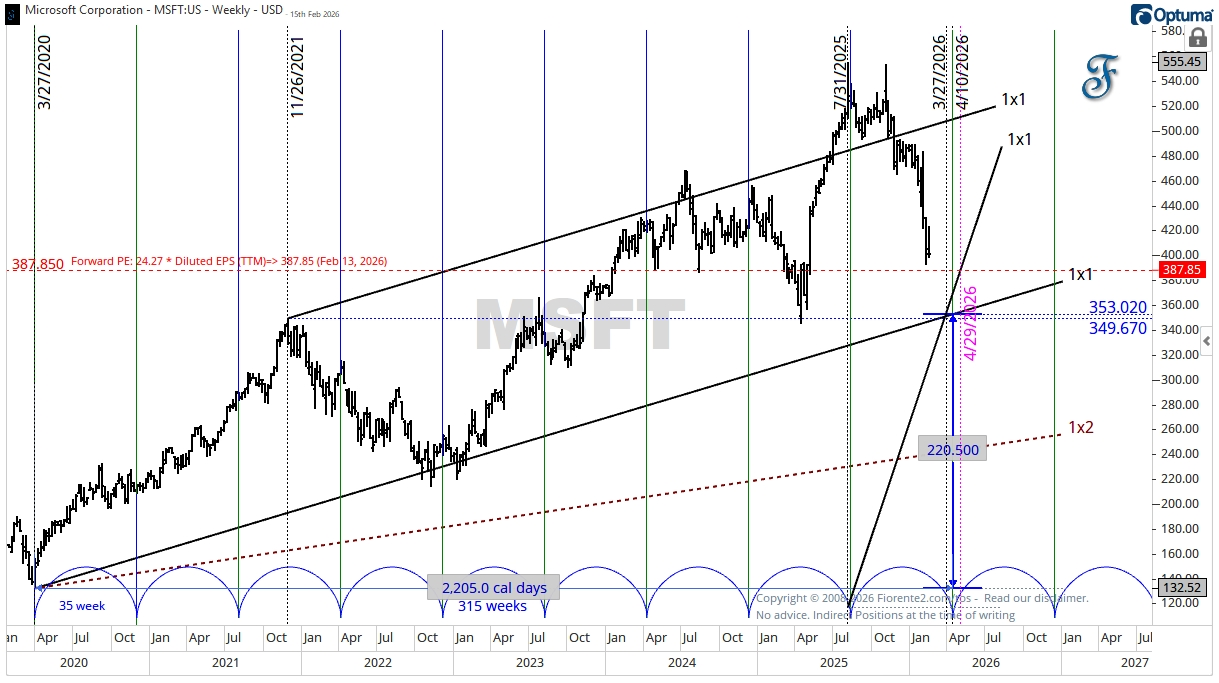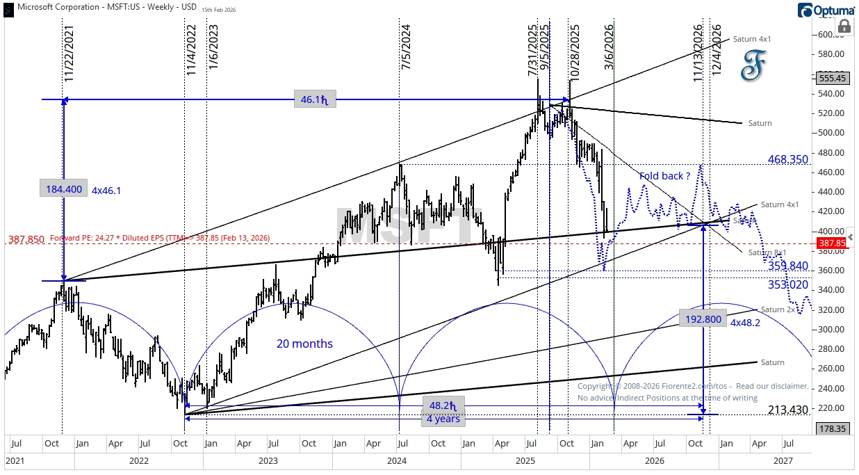 Microsoft made a double top between the end of July and October 2025, on a 4x1 Saturn timing line. The Saturn 1x1 timing line from the November 2021 high seems to give support for now.