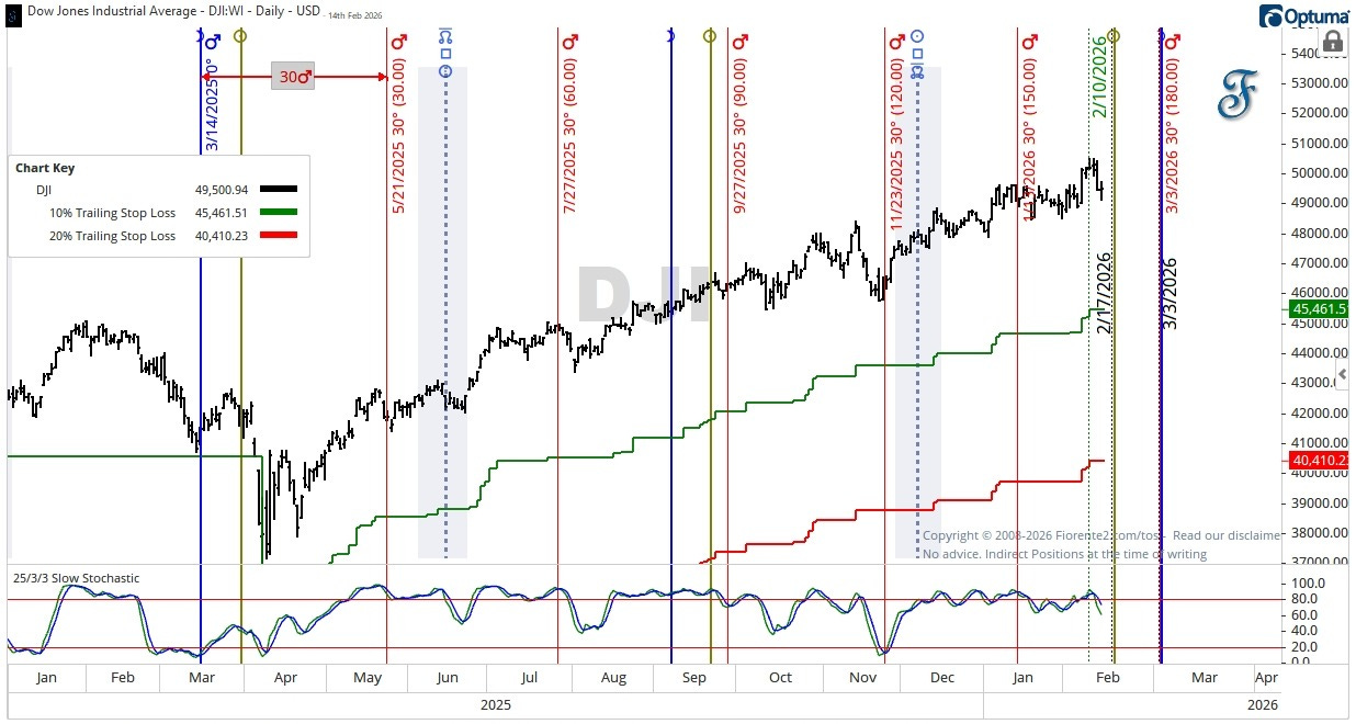 In the next few weeks, we are approaching solar (02/17/2026) and lunar (3/3/2026) eclipses. There is often considerable volatility around these dates. Monitor the market for turning points shortly before and after a solar eclipse.