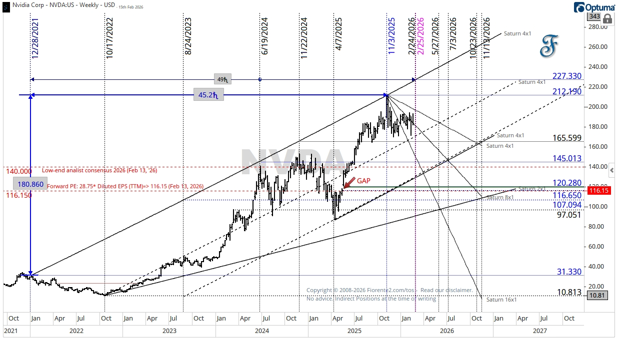 As shown in the chart below, on a 4x1 Saturn timing line, Price and Time were aligned on Nov 3rd, 2025, because four times 45.2 degrees (45.215, unrounded) corresponds to a price increase of 180.86. Hereafter, a decline set in.