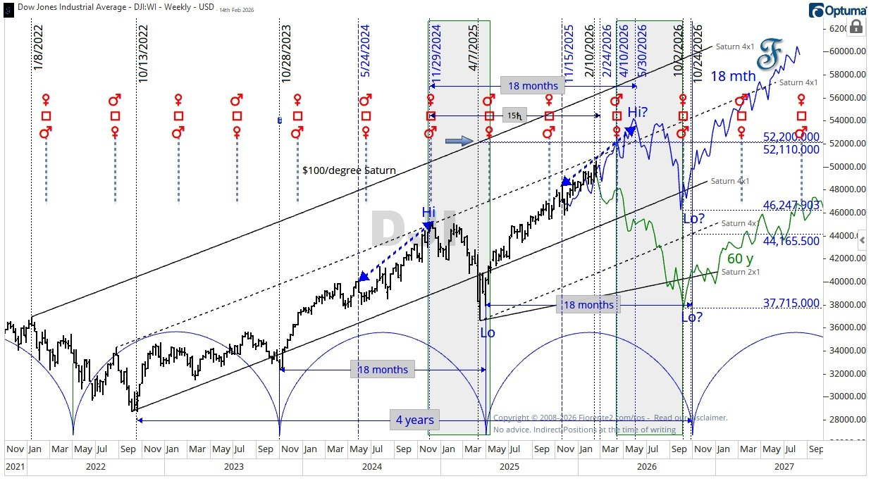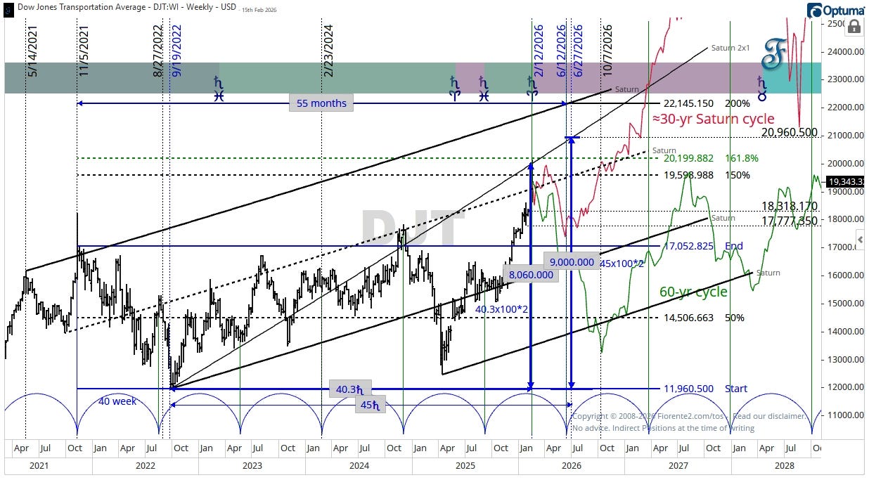The 60-year cycle is known to contract and expand from time to time due to retrograde movements of various planets by up to 8 months. We need to see what will happen in the next few weeks. The approximately 30-year Saturn cycle may invert around June 2026, giving the index some room to move higher until the end of June 2026. This is then a Fibonacci 55 months from the November 2021 high.