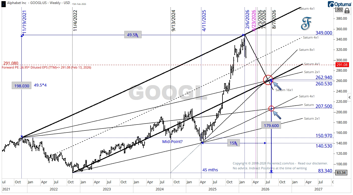 For GOOGL, a price and time square out occurred on February 6th, 2026, on a 4x1 Saturn timing line.