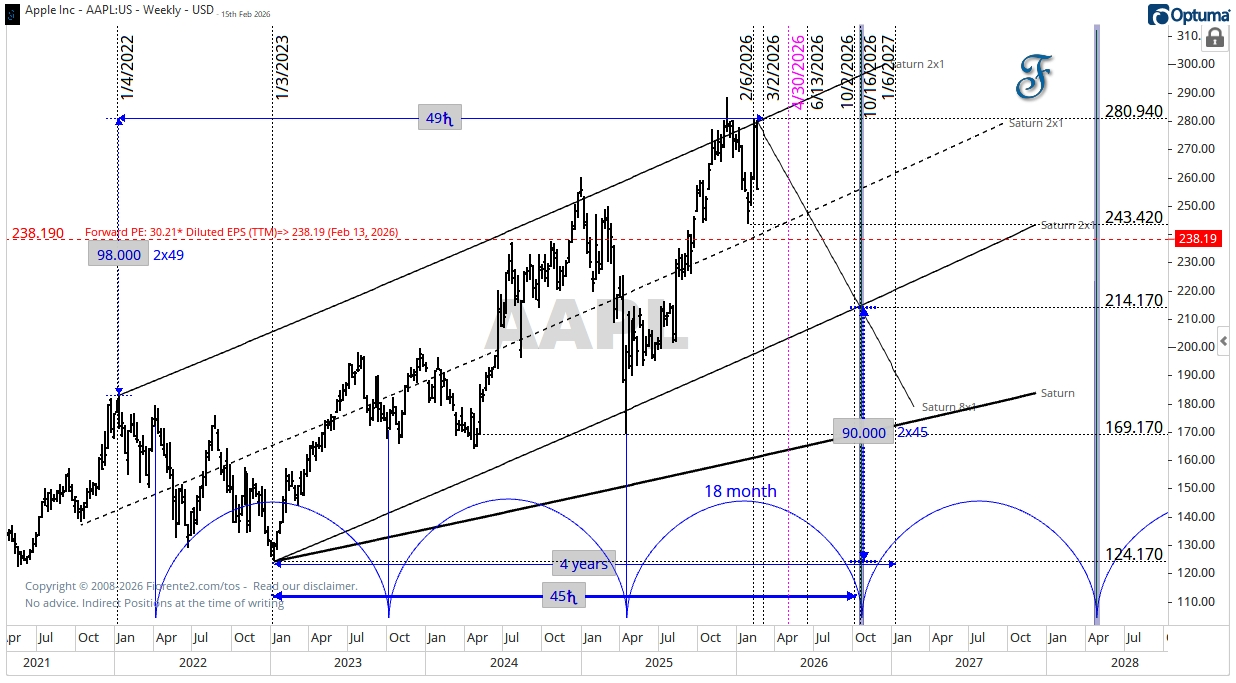 AAPL may have made a crest by February 6th, 2026, after a 49-degree move of Saturn since the high in January 2022, on a 2x1 Saturn timing line.