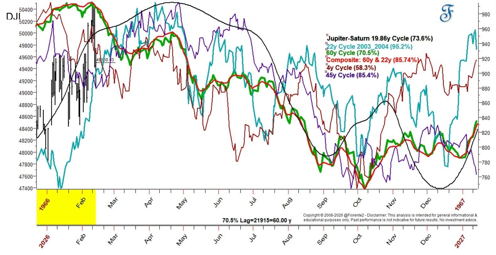 This is just one of the possible scenarios. In the chart below, you will find 5 scenarios that still have a high correlation with today’s market. The 60-, 45-, 22-, 19.86-, and 4-year cycles are plotted on the DJIA chart.
