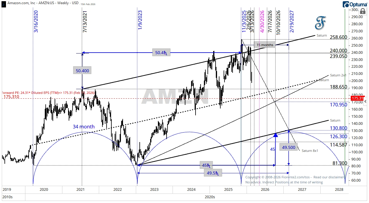 I expect Amazon to decline to at least the halfway point, or close to its fair value, in the $170- $175 range by October 2026. In a panic, I wouldn’t rule out Amazon dropping further into the lower 1x1 Saturn timing line, around $130, by February 2027.