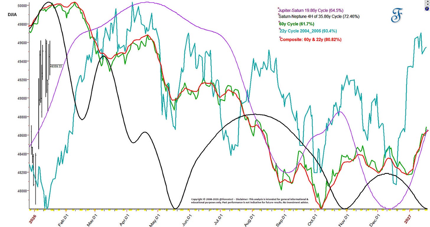 The major planetary cycles discussed show an overall decline for 2026. The nominal 60-year and 22-year time cycles discussed in the above analysis show a similar direction, but the 22-year cycle has a much smaller decline than the 60-year cycle based on its past cycles.