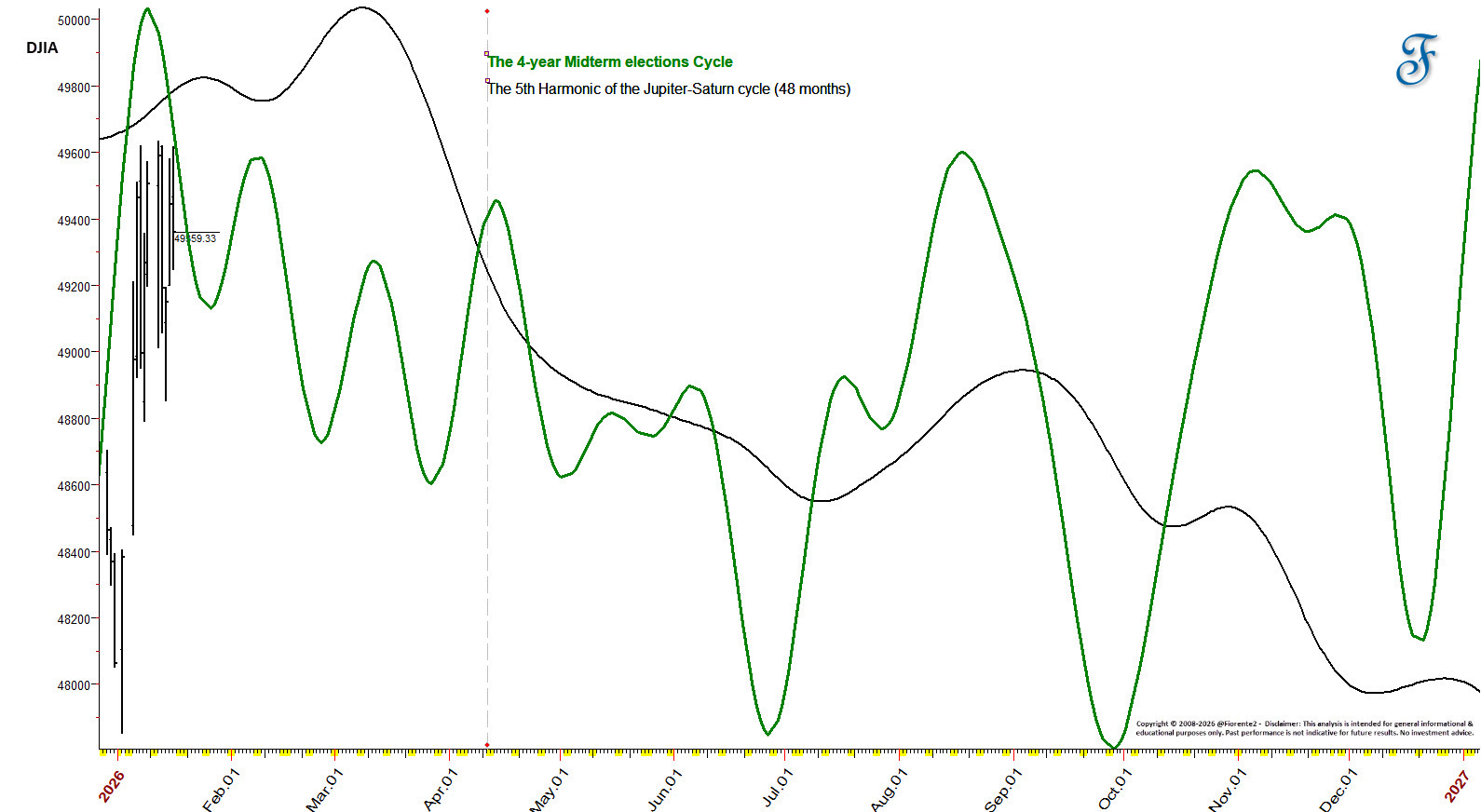 The 4-year midterm election cycle shows a decline as well. As mentioned before, we are dealing with the probability that these cycles converge to a high between January and May 2026, followed by a subsequent decline by the end of the year.