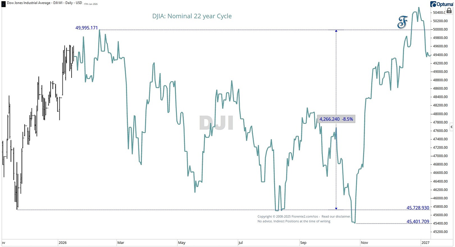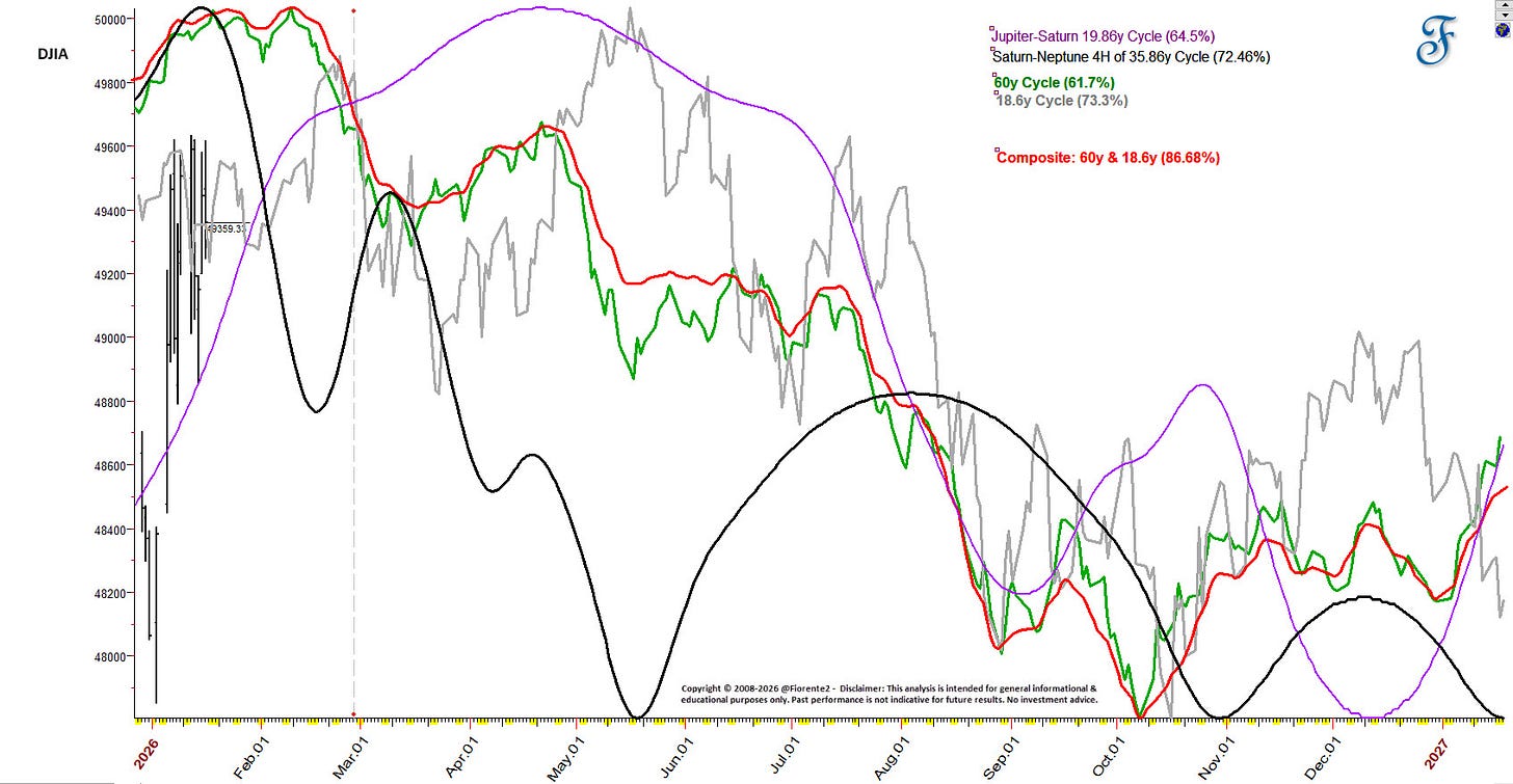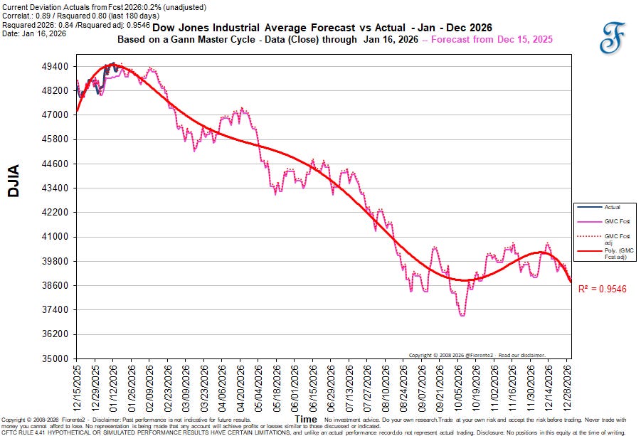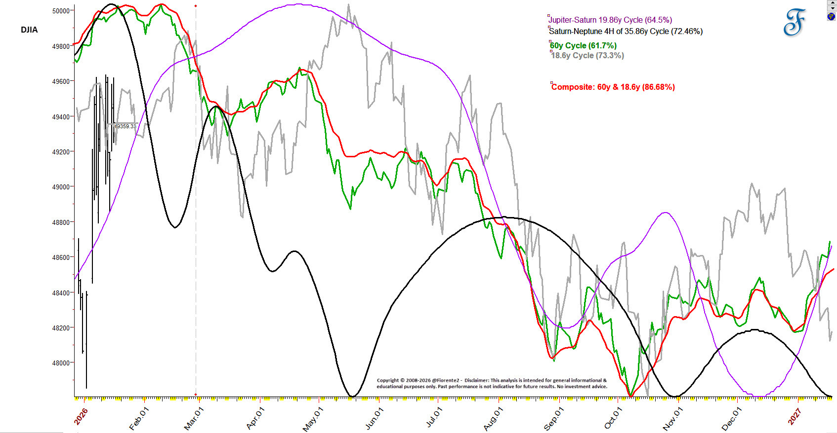 So far in 2026, the DJIA followed the 60-year cycle forecast. Going forward, the inflection points could well deviate from the forecast, which is based on this cycle’s past behavior. From time to time, inversions can occur. This forecast will dynamically adjust on a day-by-day basis once more data becomes available. I will update this frequently.