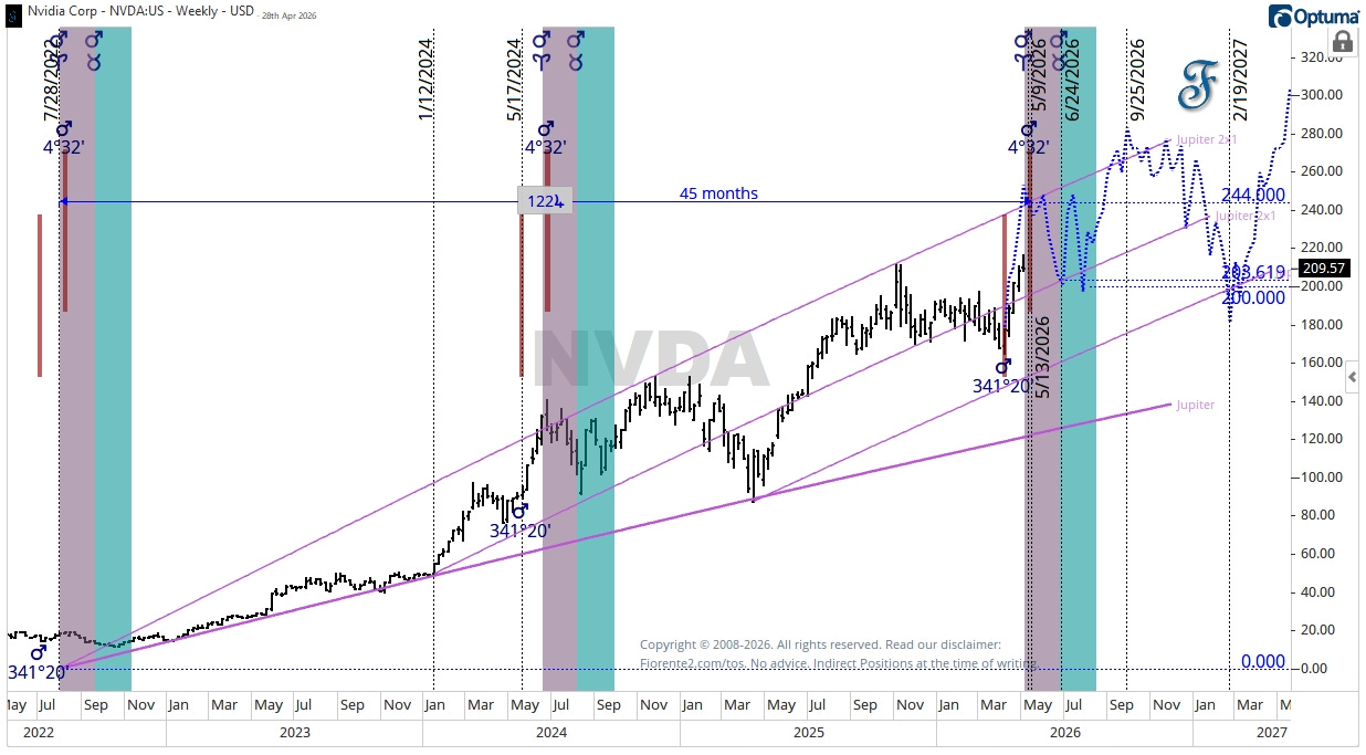 The weekly chart shows when Mars ingresses Aries and Taurus from a heliocentric perspective. Mars at 4°32’ has marked three significant turns: around the July 2022 ingress in Aries, the May 2024 high, and now April/May 2026. Based on the last two cycles, this is a key window in time for NVDA.