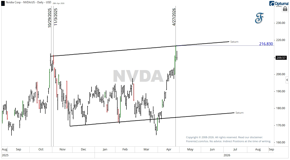Since the crest in October/early November last year, NVDA has been trading within a channel defined by two Saturn timing lines. The upper Saturn line sits at $216.830.