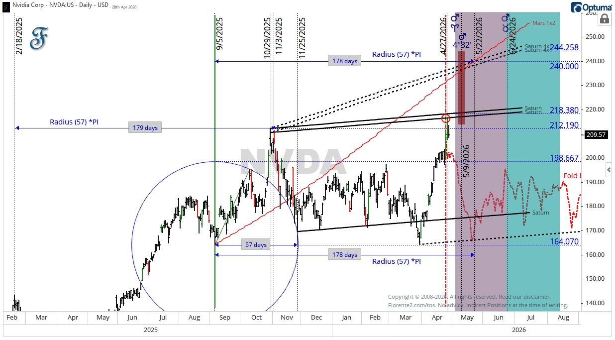 NVDA has been in a range bound move defined by two Saturn lines for the last 6 months. Yesterday NVDA hit the upper Saturn timing line at $216.83 and pulled back. As of writing it’s trading at $209.57. That kind of touch-and-retreat at a 6-month ceiling is, in my experience, worth examining closely.