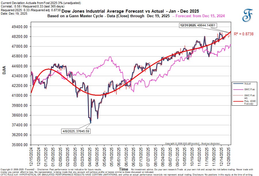 In this post, I will take a closer look at the forecasts made in the Fiorente2 Stock Market Outlook 2025. By using the 60-year Gann Master cycle, I aimed to forecast how the DJIA and S&P 500 would perform. Now, it’s time to see how accurate those forecasts were and how they relate to what actually happened in the market. I’ll also discuss some of the patterns we've seen and what they might mean for the future. Let’s dive in and explore the outcomes from the past year.