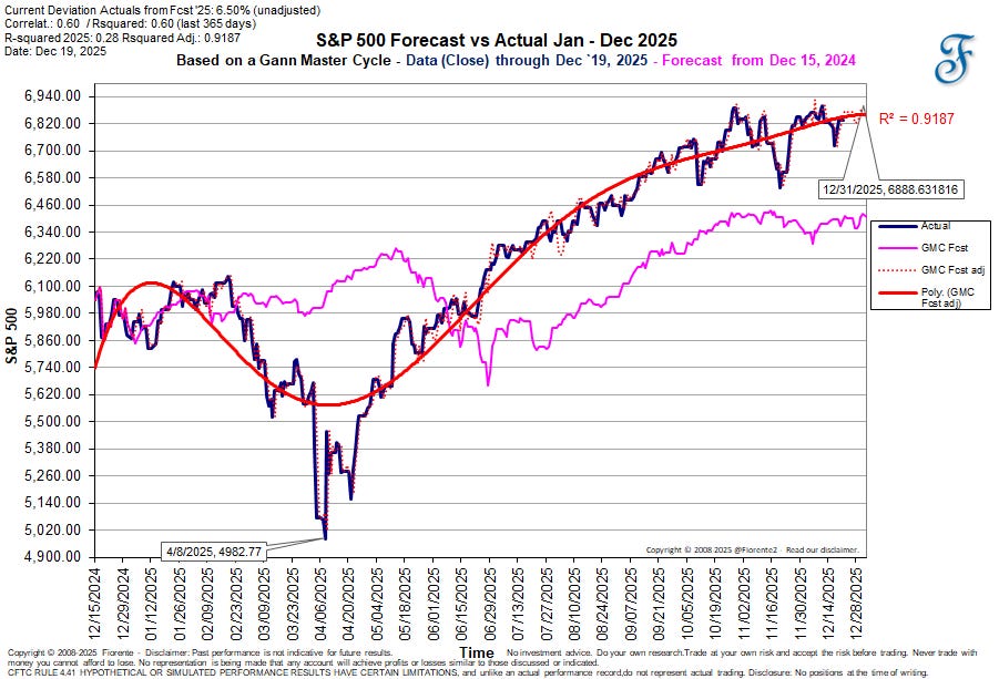 In addition, I showed that, by using the Gann Yearly Spiral chart concept and looking back at important years that create harmonic connections, one could find themes that recur or have the opposite effect. The year 2026 is going to be interesting again. I will publish my full Master Cycle forecast for 2026 for the US Indices, exclusively for all free subscribers, around the New Year.
