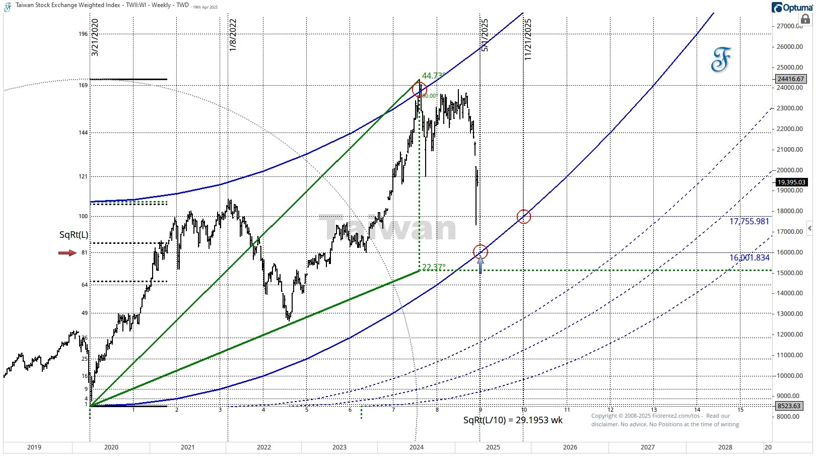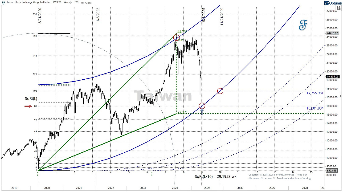 Others may not have reached a lower parabolic trendline, where they could find support, and could be vulnerable to more declines to come, as you can see in the chart below of the Taiwan Stock Exchange Weighted Index. This may be an important index to follow as the ongoing US-China trade war may influence the supply chains for the semiconductor industries worldwide.