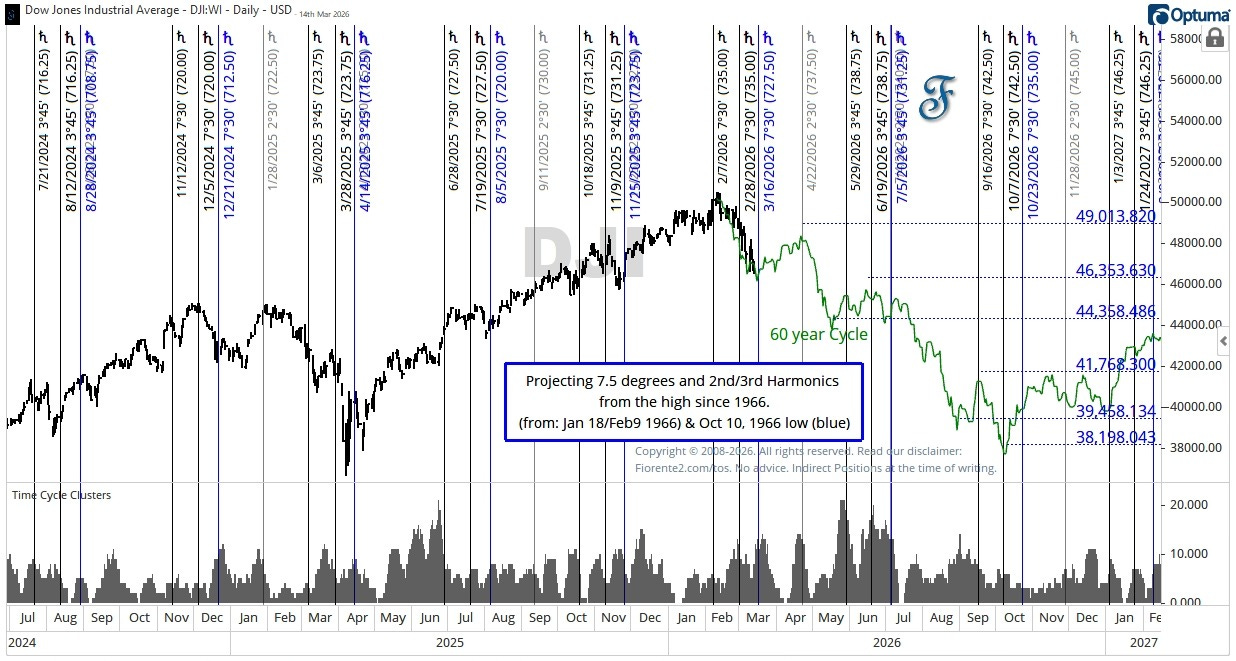 I have plotted the 60-year cycle from the same calendar day as 60 years ago (February 9th) in green, and we may be close to an inflection point, provided the DJIA continues to follow this same pattern as seen 60 years ago. Even after 60 years, there is an interesting similarity between the 1966 and 2026 inflection points.