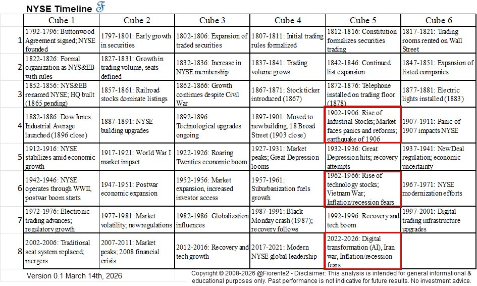 The above NYSE timeline is divided into six segments, each covering five years. Every row depicts a 30-year Saturn cycle. The five-year segments may also align with Jupiter, since 60 years, or two rows, can be divided into 12 five-year segments. Looking back 60 years, or two rows earlier, you might find that similar themes reappear in the current era. Hence, the above table shows what happened on the NYSE following both the Jupiter and Saturn cycles.