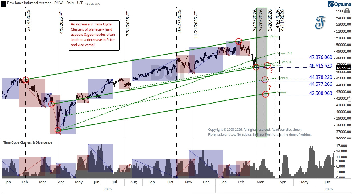 The DJIA might stay at its current level through the end of March, or it could drop to the next level. We’ll have to see how the market reacts. After March, I see the hard aspects decline into Easter, which may support some recovery. After Easter, I see the hard aspects increasing again.