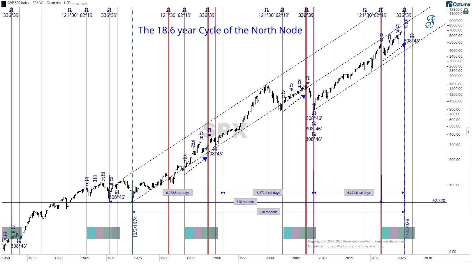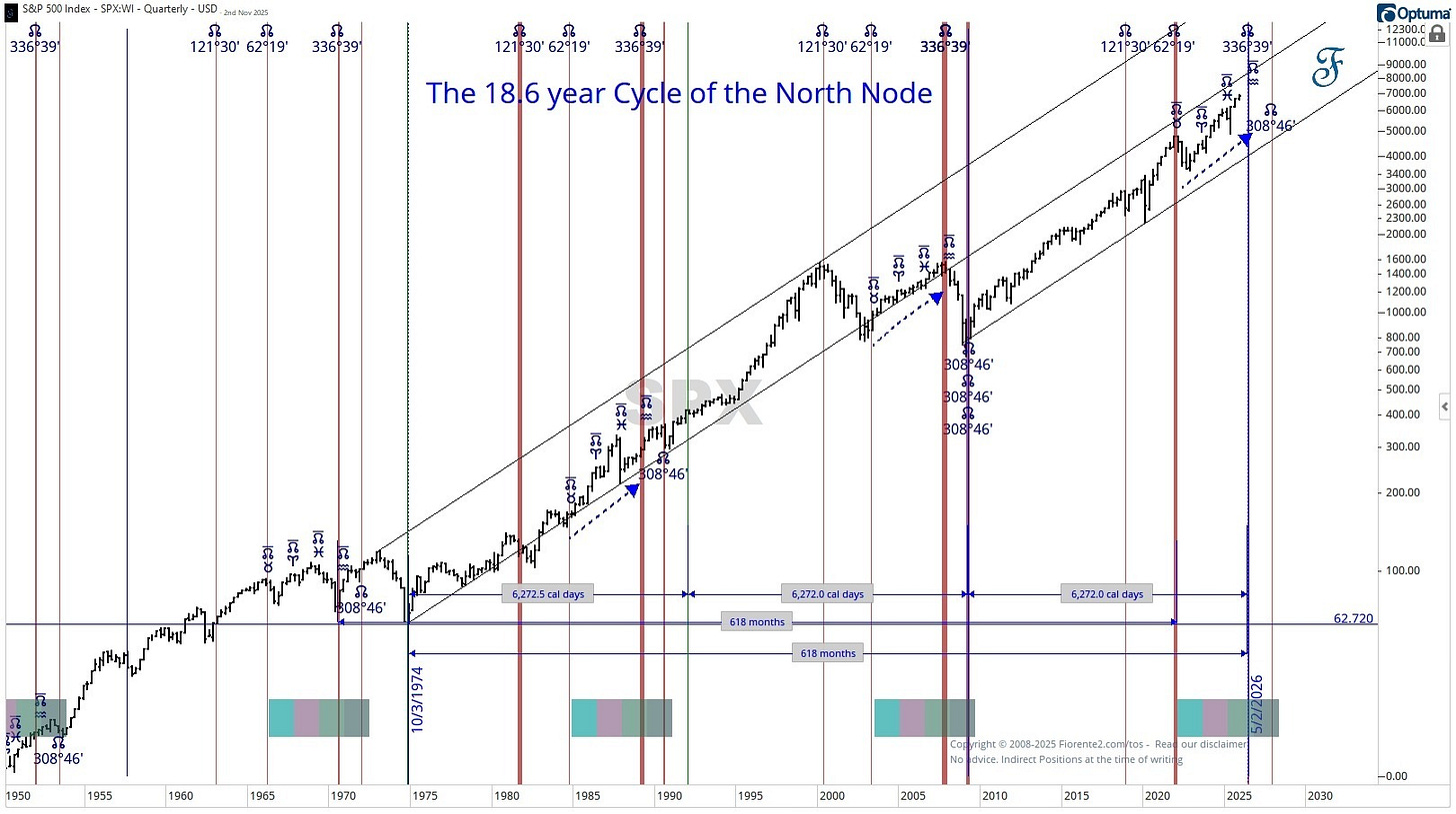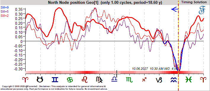 The October 2027 potential low aligns with the North Node’s position in March 2009.