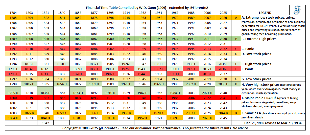 Note the sequence of 618 months, 1000 times a Fibonacci ratio of 0.618 between important highs and lows. Three equidistant lines of 100 times around the low of October 1974 (62.27) arrive at the same time target of mid-April to early May 2026.