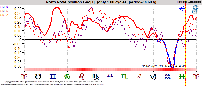 As many long-term cycles are making favorable aspects, such as the Saturn-Jupiter trine (within 1 degree), the Uranus-Neptune, and the Saturn-Uranus sextiles, we may see a high in the stock market at any time between now and mid-April to early May 2026. At this time, the North Node will reach a point in time that also coincides with the October 2007 high. Note: long-term cycles move slowly, hence it will take time before they turn over.