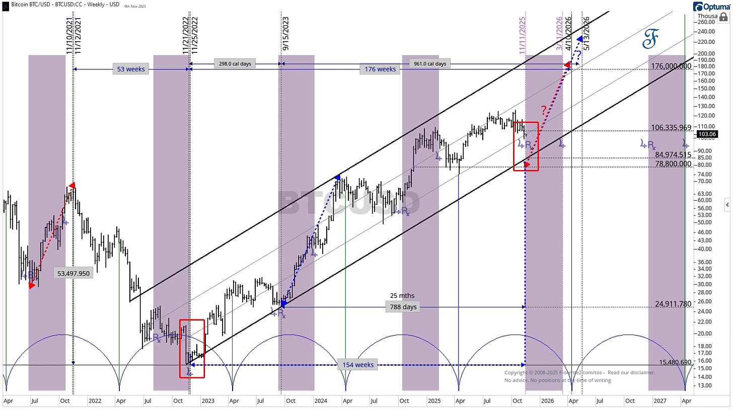 Squaring the low of November 2022 around $15,400, 154 weeks later, we will be on November 11th, 2025. This is 788 trading days from the second higher low of September 15, 2023. Can BTCUSD decline to $78,800?