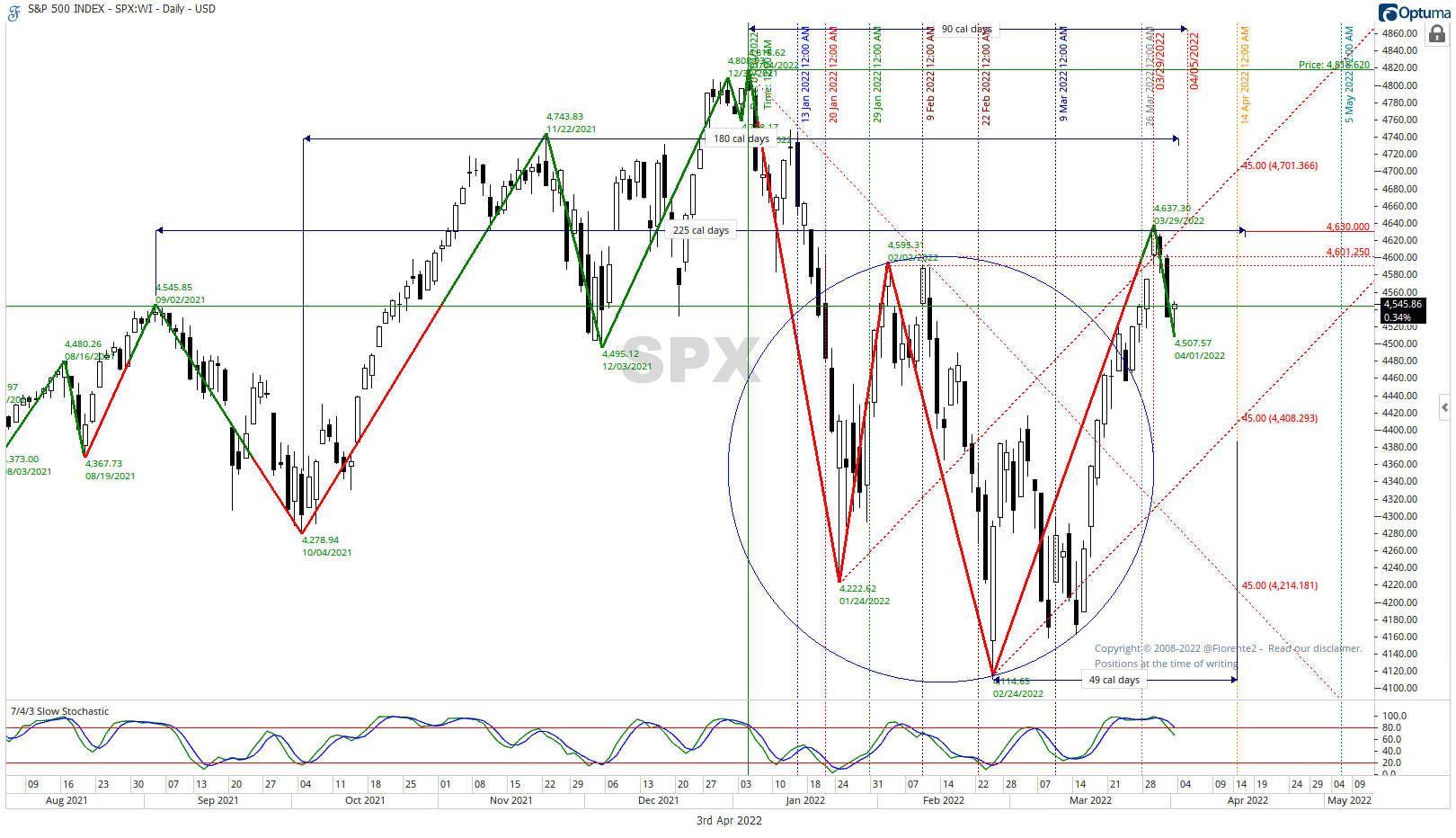 From the looks of it the S&P500 could probably turn lower into 4408. If it does this will be the next possible cycle turn as the index will be at a point where price and time have squared from the low February 24th 2022 in just 49 days, or 225 calendar days from September 2021 high.